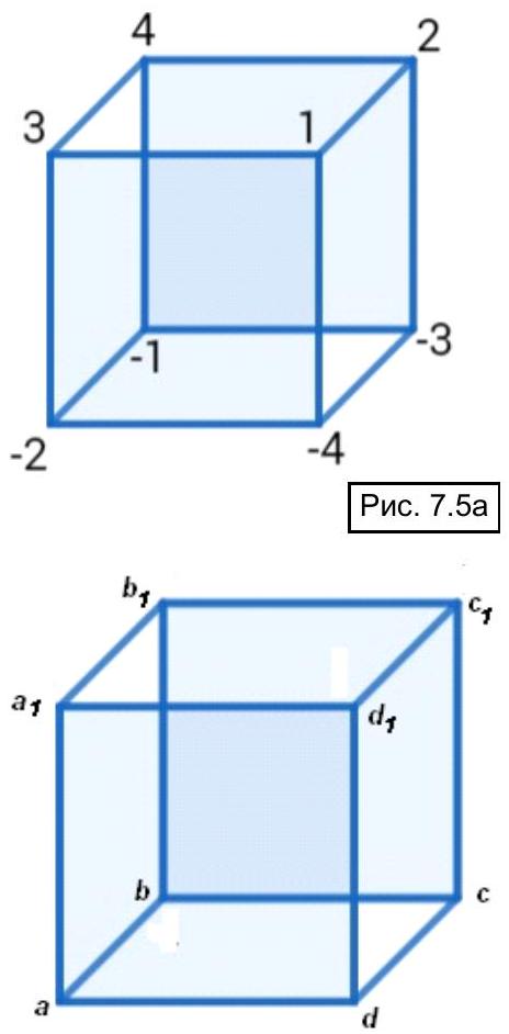 🔑:Answer: 8.Solution. See, for example, Fig. 7.5a. It is easy to verify that each vertex of the cube contains a lucky number.There are other examples as well. Let's understand how they are structured (this was not required of the olympiad participants). Let's denote the numbers at the vertices of the cube (see Fig. 7.5b). First, write down two equations for the opposite vertices of the lower square: a=a_{1}+b+d (1); c=c_{1}+b+d (2). Subtracting equation (2) from equation (1), we get: a-c=a_{1}-c_{1} (3).Now, write down similar equations for two vertices of the vertical edge: b=b_{1}+a+c (4); b_{1}=b+a_{1}+c_{1} (5). Substituting b_{1} from equation (5) into equation (4), we get: a+c=-a_{1}-c_{1} (6). Combining equations (3) and (6) into a system, we get that a=-c_{1}; c = -a_{1}. Thus, the numbers in opposite vertices of the cube must be opposite (similar equations for the other two pairs of numbers follow from the symmetry of the cube).Therefore, to construct any example, it is sufficient to choose one vertex of the cube and denote the numbers in the adjacent vertices, for example, as x, y, and z. To make the chosen vertex lucky, place the number x+y+z in it. It is only required that the absolute values of the numbers x, y, z, and x+y+z be pairwise distinct. Then, place the numbers -x, -y, -z, and -x-y-z in the opposite vertices, respectively. It is easy to verify that all eight numbers are lucky.Grading criteria.“+" Correct answer and correct example provided“-" Only the answer is provided“-” Incorrect example or no example provided