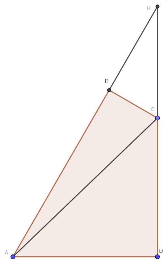 🔑:Answer: 20## Solution:The quadrilateral is inscribed, so angle A + angle C = 180^{circ}. From the given ratio, angle A = 2x, angle C = 4x. Therefore, x = 30^{circ} and angle A = 60^{circ}, angle B = 3x = 90^{circ}. Extend AB and CD to intersect at point K. Then angle K = 30^{circ}, KC = 2BC = 16sqrt{3} - 12, KD = KC + CD = 16sqrt{3}, and AD = 16. Using the Pythagorean theorem, we get AC = 20.## Solve the following problems with justification for your answer