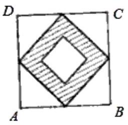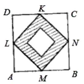 ❓:Problem 5. The figure on the right consists of three squares. The vertices of the middle square are the midpoints of the sides of square ABCD. The sum of the perimeters of the smallest and the largest square is 60 mathrm{~cm} and the perimeter of the smallest square is four times smallerthan the perimeter of the largest square. What is the area of the shaded part of the figure, i.e., the area of the figure bounded by the middle and the smallest square?