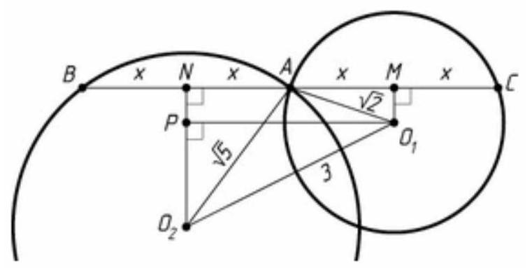 ❓:[Pythagorean Theorem (direct and inverse)] [Theorem on the sum of the squares of the diagonals] Two circles with radii sqrt{5} and sqrt{2} intersect at point A. The distance between the centers of the circles is 3. A line through point A intersects the circles at points B and C such that A B=A C (point B does not coincide with C). Find A B.