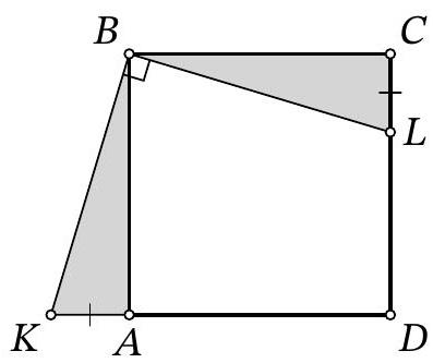 🔑:Answer: 7.Solution. Since ABCD is a square, then AB = BC = CD = AD.Fig. 1: to the solution of problem 8.4Notice that angle ABK = angle CBL, since they both complement angle ABL to 90^{circ}. Therefore, right triangles ABK and CBL are congruent by the acute angle and the leg AB = BC (Fig. 1). Consequently, AK = CL = 6. ThenLD = CD - CL = AD - CL = (KD - AK) - CL = KD - 2 cdot CL = 19 - 2 cdot 6 = 7