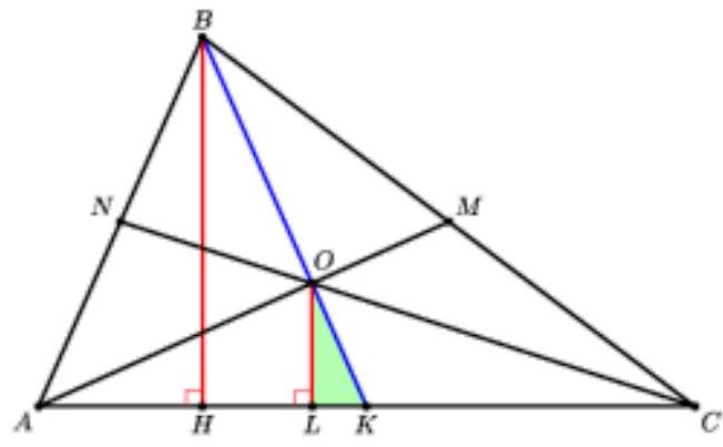 🧠:[<think>Alright, let's tackle this geometry problem step by step. So, we have triangle ABC, with medians AM and CN intersecting at point O. We need to find the distance from O to the line AC, given that angle BAC is α, angle BCA is β, and the length of AC is b. First, let me visualize the triangle. Let me sketch triangle ABC. Let me label the vertices A, B, C. So, A is at the left, B at the top, and C at the right. Then, the median AM goes from A to the midpoint M of BC, and the median CN goes from C to the midpoint N of AB. These medians intersect at point O, which is the centroid of the triangle. I remember that the centroid divides each median into a ratio of 2:1, with the longer part being closer to the vertex. So, AO:OM = 2:1 and CO:ON = 2:1.We need the distance from O to AC. That distance is the perpendicular distance from point O to the line AC. Let me denote this distance as h. So, h is the length of the perpendicular segment from O to AC.Given angles at A and C: angle BAC = α, angle BCA = β. Also, side AC has length b. So, AC is the base of the triangle with length b. Maybe we can use some trigonometric relationships here.Let me recall that in a triangle, the centroid divides each median into a 2:1 ratio. Therefore, if I can find the lengths of the medians AM and CN, perhaps I can find the coordinates of O, and then compute the distance from O to AC.Alternatively, maybe coordinate geometry would be a good approach here. Let me try placing triangle ABC in a coordinate system to simplify calculations. Let me place point A at the origin (0,0) and point C at (b,0), since AC is of length b. Then, point B will be somewhere in the plane; we need to determine its coordinates.Given angles at A and C, we can use the Law of Sines to find the other sides. Let me recall that the Law of Sines states that in any triangle, (a/sin A) = (b/sin B) = (c/sin C). Wait, here AC is given as length b. Let me make sure I use the correct notation. Let's denote sides as follows: BC = a, AB = c, AC = b. Then, according to the Law of Sines:a / sin α = b / sin B = c / sin β.Wait, angle at A is α, angle at C is β, so angle at B would be 180° - α - β. So, angle B = π - α - β.Therefore, sides can be expressed in terms of b and the angles. Let's compute sides AB and BC.First, using Law of Sines:AB / sin β = AC / sin B => AB = (b * sin β) / sin (π - α - β)But sin (π - x) = sin x, so sin (π - α - β) = sin (α + β). Therefore, AB = (b sin β) / sin (α + β). Let's denote AB as c = (b sin β) / sin (α + β).Similarly, BC / sin α = AC / sin B => BC = (b sin α) / sin (α + β). Denote BC as a = (b sin α) / sin (α + β).Now, let's place the triangle in the coordinate system. Let me fix points A and C. Let’s set A at (0, 0) and C at (b, 0). Then, point B has coordinates (x, y), which we need to determine.Since angle BAC is α, the coordinates of B can be found using trigonometry. If we consider AB as a vector from A(0,0) to B(x,y), then the angle between AB and AC (which is along the x-axis) is α. Wait, but angle BAC is α, so angle between AB and AC is α. However, AB is not necessarily along the x-axis. Wait, no. Since AC is along the x-axis from (0,0) to (b,0), the angle at A (angle BAC) is the angle between AB and AC. So, AB makes an angle α with AC (the x-axis). Therefore, the coordinates of B can be determined using the length of AB and the angle α.Wait, but AB is length c = (b sin β)/ sin(α + β). So, if we go from A(0,0) at an angle α, then the coordinates of B would be (c cos α, c sin α). But is that correct?Wait, hold on. If angle BAC is α, then if we place point A at the origin, AC along the x-axis to (b,0), then point B is somewhere in the plane. The angle at A is between AB and AC, which is the angle between AB and the x-axis. So, if AB has length c, then the coordinates of B would be (c cos α, c sin α). But then, AC is length b, so the distance from A to C is b. Therefore, AC is from (0,0) to (b,0). Then, point B is at (c cos α, c sin α). Then, the coordinates of B are (c cos α, c sin α). Then, point C is at (b, 0). So, the coordinates are:A: (0, 0)B: (c cos α, c sin α) = ( (b sin β / sin(α + β)) cos α, (b sin β / sin(α + β)) sin α )C: (b, 0)Alternatively, maybe coordinate geometry is complicating things. Let me see if there's another approach.Alternatively, since we need the distance from O to AC, which is a height, perhaps we can relate this to the area of the triangle or the area related to the centroid.Wait, the centroid divides each median into a 2:1 ratio, so the distance from the centroid to a side should be one-third of the corresponding median? Wait, no. The centroid is located at the average of the three vertices' coordinates, so maybe the distance from the centroid to a side can be related to the distances from the vertices.Alternatively, the distance from O to AC can be found by considering the area of triangle AOC, since O is the centroid. The area of triangle AOC is one-third of the area of triangle ABC because the centroid divides the triangle into three smaller triangles of equal area.Let me verify that. The centroid divides the triangle into six smaller triangles of equal area, so each of the three medians creates two triangles each with equal area. Therefore, triangles AOC, AOB, and BOC each have area one-third of the original triangle ABC.Therefore, if we can compute the area of triangle AOC, then since AC is the base with length b, the height h (distance from O to AC) would satisfy:Area of AOC = (1/2) * b * hBut Area of AOC is (1/3) Area of ABC. Therefore,(1/2) * b * h = (1/3) * Area of ABCTherefore, h = (2 / 3b) * Area of ABCTherefore, if we can compute the area of ABC, we can find h.So, let's compute the area of ABC. Using the given angles and side AC = b, we can compute the area. Let's recall that the area of a triangle can be given by (1/2)ab sin C, where a and b are sides and C is the included angle.In triangle ABC, we kn