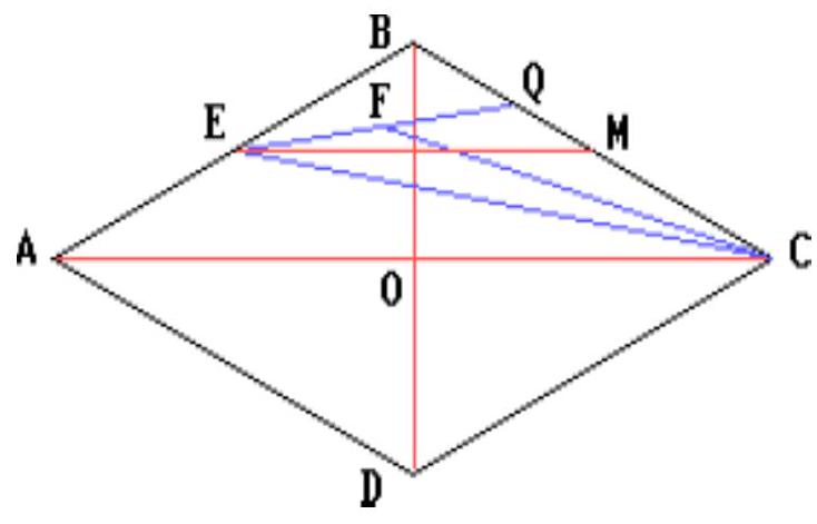 🔑:Use the formula for the median of a triangle:m^{2}=frac{1}{4}left(2 a^{2}+2 b^{2}-c^{2}right)where a, b, c are the sides of the triangle, and m is the median drawn to the side equal to c.## SolutionWe will use the formula for the median of a triangle:m^{2}=frac{1}{4}left(2 a^{2}+2 b^{2}-c^{2}right)where a, b, c are the sides of the triangle, and m is the median drawn to the side equal to c.Let B Q=x, A C=2 y. Let O be the intersection point of the diagonals of the rhombus A B C D, and M be the midpoint of side B C. ThenO C=y, A B=B C=4 x, M Q=xand since M E is the midline of triangle A B C, we have M E=frac{1}{2} A C=y.Since E Q is the median of triangle B E M, we haveE Q^{2}=frac{1}{4}left(2 B E^{2}+2 E M^{2}-B M^{2}right) text {, or } 2=frac{1}{4}left(2 cdot 4 x^{2}+2 y^{2}-4 x^{2}right)or2 x^{2}+y^{2}=4Since C E is the median of triangle A B C, we haveC E^{2}=frac{1}{4}left(2 A C^{2}+2 B C^{2}-A B^{2}right)=frac{1}{4}left(8 y^{2}+32 x^{2}-16 x^{2}right)=4 x^{2}+2 y^{2}Since C F is the median of triangle C E Q, we have8=C F^{2}=frac{1}{4}left(2 C E^{2}+2 C Q^{2}-E Q^{2}right)=frac{1}{4}left(8 x^{2}+4 y^{2}+18 x^{2}-2right)=frac{1}{4}left(26 x^{2}+4 y^{2}-2right)from which13 x^{2}+y^{2}=17From the obtained system of equationsleft{begin{array}{l}2 x^{2}+y^{2}=4 13 x^{2}+y^{2}=17end{array}right.we find that x=1, y=sqrt{2}. ThenO B^{2}=B C^{2}-O C^{2}=16-2=14Let O P be the height of the right triangle B O C. Then O P is the radius of the circle inscribed in the rhombus. Since B C cdot O P=O B cdot O C, we haveO P=frac{O B cdot O C}{B C}=frac{sqrt{14} cdot sqrt{2}}{4}=frac{sqrt{7}}{2} text {. }![](https://cdn.mathpix.com/cropped/2024_05_06_f7f9d90261bfc416bd71g-13.jpg?height=471&width=734&top_left_y=1794&top_left_x=662)Answerfrac{sqrt{7}}{2}.