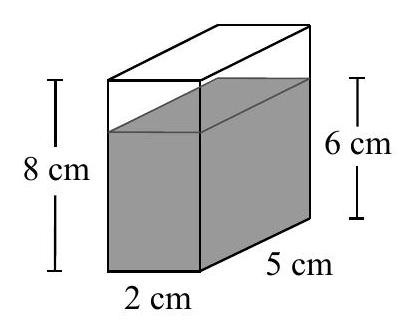 🔑:The water is in the shape of a rectangular prism with a 2 mathrm{~cm} by 5 mathrm{~cm} base and depth 6 mathrm{~cm}.Therefore, the volume of water is 2 mathrm{~cm} times 5 mathrm{~cm} times 6 mathrm{~cm}=60 mathrm{~cm}^{3}.A face of the prism having the greatest area has dimensions 5 mathrm{~cm} by 8 mathrm{~cm}.When the prism is tipped so that it stands on a 5 mathrm{~cm} by 8 mathrm{~cm} face, the water is once again in the shape of a rectangular prism with a 5 mathrm{~cm} by 8 mathrm{~cm} base and unknown depth.Suppose that after the prism is tipped, the water's depth is d mathrm{~cm}.Since the volume of water is still 60 mathrm{~cm}^{3} when the prism is tipped, then 5 mathrm{~cm} times 8 mathrm{~cm} times d mathrm{~cm}=60 mathrm{~cm}^{3} or 40 d mathrm{~cm}^{3}=60 mathrm{~cm}^{3}, and so d=frac{60}{40}=frac{3}{2}.When the prism is tipped so that it stands on a face with the greatest area, the depth of the water is frac{3}{2} mathrm{~cm}=1.5 mathrm{~cm}.ANSWER: (D)#